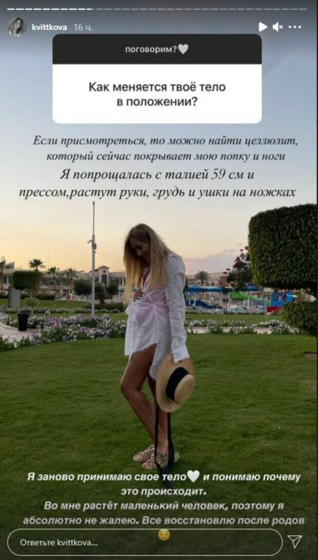 На вопрос, что же изменилось за время беременности ее тело, Квиткова ответила предельно честно: «Если присмотреться, то сейчас можно найти на моем теле целлюлит, который покрывает мою попку и ноги. Я попрощалась с талией в 59 см и прессом. Теперь растут руки, грудь и «ушки» на ножках". Тем не менее, Даша отмечает, что учится заново принимать свое тело, ведь понимает, почему с ней происходят такие перемены. «Во мне растет маленький человек, поэтому я абсолютно ни о чем не жалею. Все восстановится после родов». В последующих Сторис Даша отметила, что у нее также сильно опухает тело и теперь ноги "как колоды". Пара активно делится новостями и фотографиями о беременности. В одном из последних постов Дарья показала живот, позируя в купальнике. Красотка позировала близко к камере, гладила округлую часть тела и улыбалась. "Пузико растёт не по дням, а по часам