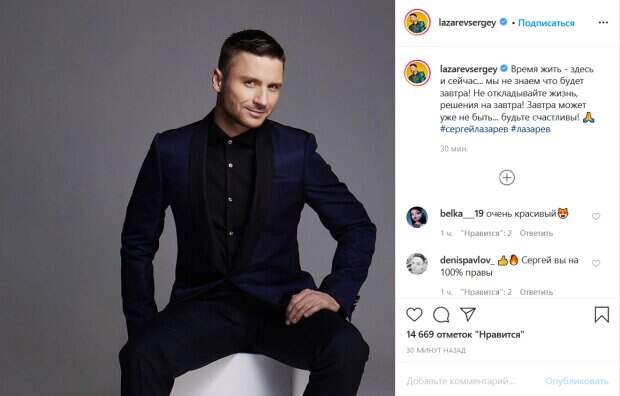 Строгий темно-синий наряд с черной рубашкой добавляет особую изюминку в общий образ певца. Лазарев пристало смотрит в камеру и слегка улыбается, из-за чего его выражение лица выглядит слегка проказливым. «Время жить - здесь и сейчас... мы не знаем что будет завтра! Не откладывайте жизнь, решения на завтра! Завтра может уже не быть... будьте счастливы!», - подписал снимок артист. Его поклонники бурно отреагировали на новый пост. «очень красивый», «Симпатяга», «Шикарный костюм и шикарный Сергей», «а ты счастлив? Почему не женился до сих пор», «Какое красивое фото и какие мудрые слова. Сергей Вячеславович и вы будьте счастливы!», - пишут люди. Ранее мы писали, что Лорак засветилась с известным российским певцом Сергеем Лазаревым. Звезда опубликовала снимок на своей странице в Instagram. В этот раз на странице Лорак появилось совместное фото с певцом, на котором он прижался к певице. Стоит отметить, что взгляд Лазарева был затуманен, и в целом фото выглядело довольно жарким. «Угадайте, кто самый лучший мастер селфи?», - подписала фото звезда, в очередной раз заинтриговав поклонников. Напомним, счастливая Ани Лорак заинтриговала жарким фото с Лазаревым, сеть кипит. Как сообщала Politeka, помолодевшая Ани Лорак надула губы, поразив неудачной пластикой: "Ну хватит уже! ". Также Politeka писала, что дерзкий Лазарев покорил уверенной походкой на прогулке, Лорак не устоит.