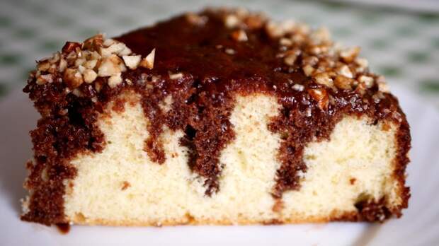 Для этого слегка взбейте яйца. Затем постепенно добавьте сахар. Когда масса увеличится в объеме и посветлеет, добавьте растительное масло и перемешайте. Муку смешайте с разрыхлителем. Небольшими порциями соедините сухие ингредиенты с пышной массой. Форму (диаметр 24) смажьте сливочным маслом. Переложите тесто и отправьте в духовку. Выпекать бисквит 35-40 минут при 160 ℃. Пропитка. Возьмите небольшую кастрюлю. Смешайте в ней сахар, какао, сливочное масло и теплую воду. Поставьте на средний огонь. Масса должна немного нагреться и стать однородной. Когда бисквит немного остынет в форме, переложите его на решетку. Зубочистками или деревянными шпажками сделайте отверстия сверху. Затем верните бисквит обратно в форму, и вылейте пропитку. Сверху посыпать орехами.
