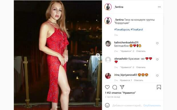 Впрочем, несмотря на такую занятость певица, как выяснилось, успевает еще и развлекаться, посещая концерты других звезд. Так, на одной из ее фан-страниц в Инстаграм появились свежие фото Кароль, на которых она запечатлена во время такого мероприятия. Об этом пишет Politeka.net. Как сообщается в подписи, певицу засняли на концерте группы «Коррупция». Для посещения их выступления Кароль выбрала весьма нескромный образ. Так, певица предстала перед камерами в вызывающем красном платье из легкой ткани в цветочек. Внимание к себе не могло не привлечь очень глубокое декольте на кокетливых завязках, а также высокий разрез на юбке. Волосы певица оставила распущенными, а в качестве украшения использовала нежный чокер. В целом ее образ получился очень женственным и томным. Поклонников фото звезды не оставили равнодушными. «Бесподобна», «Красивая -же», «Няшка», «Тине нравится эта группа? Неожиданно. Джаз, блюз, шансон -не знаю как определить их стиль - но ИНТЕРЕСНО и непривычно. Раньше даже не слышала об этой группе, но благодаря Тине заинтересовалась и мне понравилось», «Красотка», «Леди в красном», «Огонь», - пишут люди в комментариях к фото. Отметим, что совсем недавно Кароль заработала баснословную сумму благодаря одному отпечатку своего пальца. Так, певица выставила такой необычный лот на NTF аукцион, получив за него 100 тысяч гривен. Кароль рассказала об этом поклонникам, а также раскрыла секрет, куда потратит деньги. Как выяснилось, певица не собирается спускать их на себя: вместо этого она передаст средства проекту «Молода кров». Этот проект представляет собой сборник песен от украинских звезд, который должен выйти ко Дню Независимости Украины. По словам самой Тины, в нем будут представлены неожиданные дуэта, а также совсем новые исполнители. Певица отметила, что авторы проекта хотят, чтобы украинцы помнили историю, но в то же время создавали и новую. Напомним, Тина Кароль в узком топе и платочке показала, какой игривой может быть: "Боже, идеальная женщина". Как сообщала Politeka, Кароль впечатлила глубиной декольте, примеряв бальное платье. Также Politeka писала, что Кароль в платье с узким корсетом заворожила видом декольте, глаз не отвести.