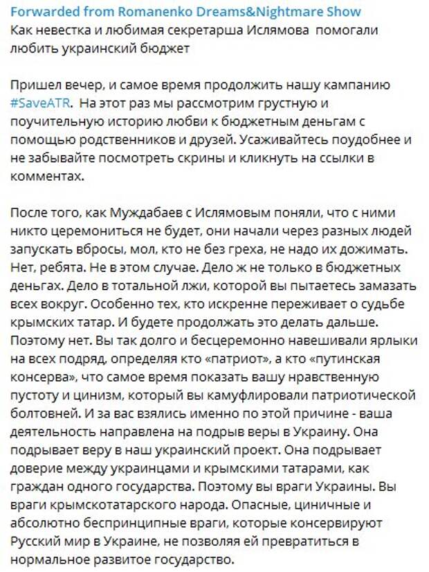 После того, как Муждабаев с Ислямовым поняли, что с ними никто церемониться не будет, они начали через разных людей запускать вбросы, мол, кто не без греха, не надо их дожимать. Нет, ребята. Не в этом случае. Дело ж не только в бюджетных деньгах. Дело в тотальной лжи, которой вы пытаетесь замазать всех вокруг. Особенно тех, кто искренне переживает о судьбе крымских татар. И будете продолжать это делать дальше. Поэтому нет. Вы так долго и бесцеремонно навешивали ярлыки на всех подряд, определяя кто «патриот», а кто «путинская консерва», что самое время показать вашу нравственную пустоту и цинизм, который вы камуфлировали патриотической болтовней. И за вас взялись именно по этой причине - ваша деятельность направлена на подрыв веры в Украину. Она подрывает веру в наш украинский проект. Она подрывает доверие между украинцами и крымскими татарами, как граждан одного государства. Поэтому вы враги Украины. Вы враги крымскотатарского народа. Опасные, циничные и абсолютно беспринципные враги, которые консервируют Русский мир в Украине, не позволяя ей превратиться в нормальное развитое государство. При этом я прекрасно понимаю, что многим не нравлюсь, что пытаются использовать эти два «твикса» русского мира. Но я ведь не предлагаю верить мне на слово. Проверьте факты. Просто проверьте факты и сделайте выводы. Вот вам самое простое. В 2016-2018 гг. Ислямов получил на свою частную компания «Атлант-СВ» 124,3 млн грн. прямой государственной поддержки. Аудит Счетной палаты зафиксировал, что 68,8 млн. грн. из этих денег ($2,5 млн.) были перечислены ООО «К’артбаба Продакшн». Это можно проверить через любой сервис, который отслеживает проводки бюджетных денег. Никакой отчетности, что было закуплено у этой ООО и по какой цене, нет. Ислямов её просто не показал аудиторам. Любой другой бы только за это уже не вылазил бы с допросов. Теперь посмотрите в любом реестре - до 22.08.2018 г. владельцем и директором ООО «К’артбаба Продакшн» так же был Ленур Ислямов. Т.е., он бесконтрольно перегонял бюджетные деньги сам себе. Сначала Ислямов платил за контент разным компаниям, а с 2018 г. начал тупо всё сливать на одну свою. Потом у ООО «К’артбаба Продакшн» фиктивно сменился владелец и директор. Вот вам факты, почему фиктивно. Во-первых, вбейте коды ЕДРПОУ в любой инструмент мониторинга бюджетных денег и убедитесь – после «смены» бенефициара взаимоотношения компании «Атлант-СВ» и «К’артбаба Продакшн» не изменились. Прилагаю образцы проводок за 2019 и 2020 годы. В 2019 г. канал ATR (ООО «Атлант-СВ») получил из бюджета 35 млн. грн. Из них 34,5 млн грн. Ислямов перегнал ООО «К’артбаба Продакшн». Т.е., 99% государственной помощи каналу ATR Ислямов слил на другую частную компанию. В конце года Госказначейство отказалось дальше проводить деньги, потому что они всё это видят и к ним на тот момент уже пришёл аудит Счетной палаты. В 2020 г. Ислямов через скандал вынудил Зеленского публично пообещать деньги, ему снова перечислили из бюджета 50 млн. грн. И что мы видим? Из 50 млн. прямой государственной помощи Ислямов 40,5 млн. снова перегоняет ООО «К’артбаба Продакшн». А теперь, во-вторых. Я призывают всех штатных антикоррупционеров, всех борцов за журналистские стандарты и прозрачность медиа задать Ислямову два простых вопроса. Правда ли, что Абиева Алиме Юнусовна, которая числится владельцем ООО «К’артбаба Продак
