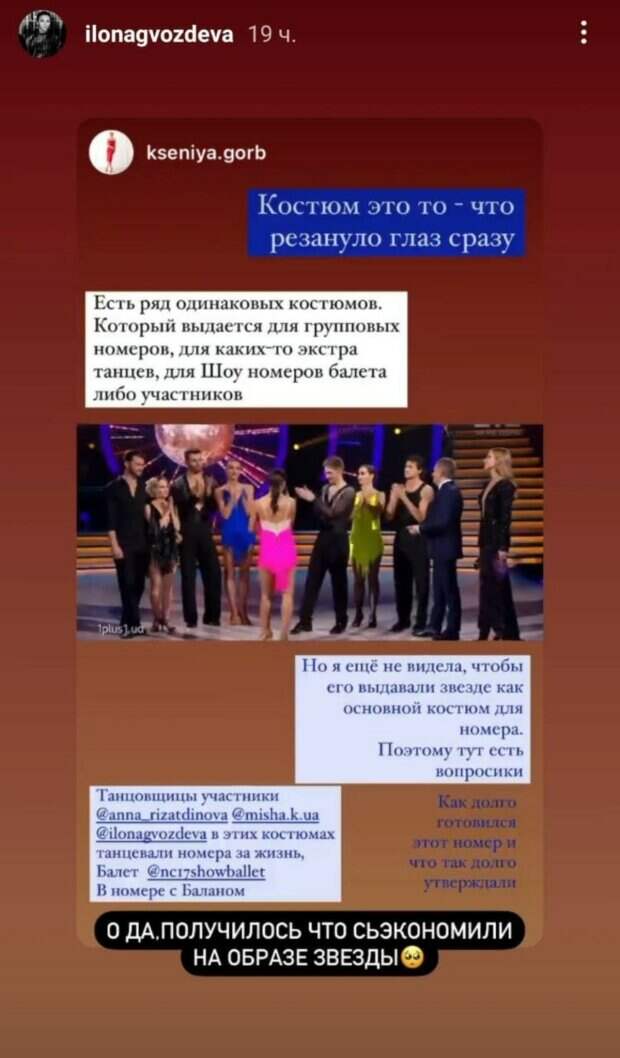 В этот раз звезда высказалась об образе Евгении Власовой в новом эфире: «Оценка 7 из 10. Номер был достаточно неплохой, как для Евгении Власовой. Но опять в номере балет, опять те же приемы, думаю это реально недоработки или полная флегматичность партнера к образам пары, к сюжету номера, да и в целом к их паре. Складывается впечатление, что Максу абсолютно все равно. Макс, прости, но так выглядит это все. Слишком простой костюм, как для звезды. Хотя Евгения старалась изо всех сил, в ней столько огня и жизни, не понимаю, почему все время в их номерах куча ненужного антуража», - высказалась о танцах Илона. По мнению Илоны, в целом у нее общие впечатления честно сказать смешанное. С одной стороны - фееричное крутое начало, с другой стороны- слишком много в течении эфира балета Freedom причём во всех его проявлениях. «По танцам мне действительно хватило Латины, все ребята были яркие, эмоциональные, динамичные, в этом эфире меньше внимания уделялось видеопроекциям, больше акцент был на самих участниках, на мой взгляд, безусловно, все стали на голову выше от предыдущего эфира, но по съёмке и сюжетам во многих номерах есть вопросы», - высказалась хореограф. Напомним, Melovin с партнершей по "Танцям з зірками" взбесили Илону Гвоздеву А еще Politeka сообщала, что Гвоздева из "Танців з зірками" показала сына, после того, как с ним случилась беда Также Politeka писала, что Гвоздева раскрыла, как обделяют некоторых участников "Танців з зірками"