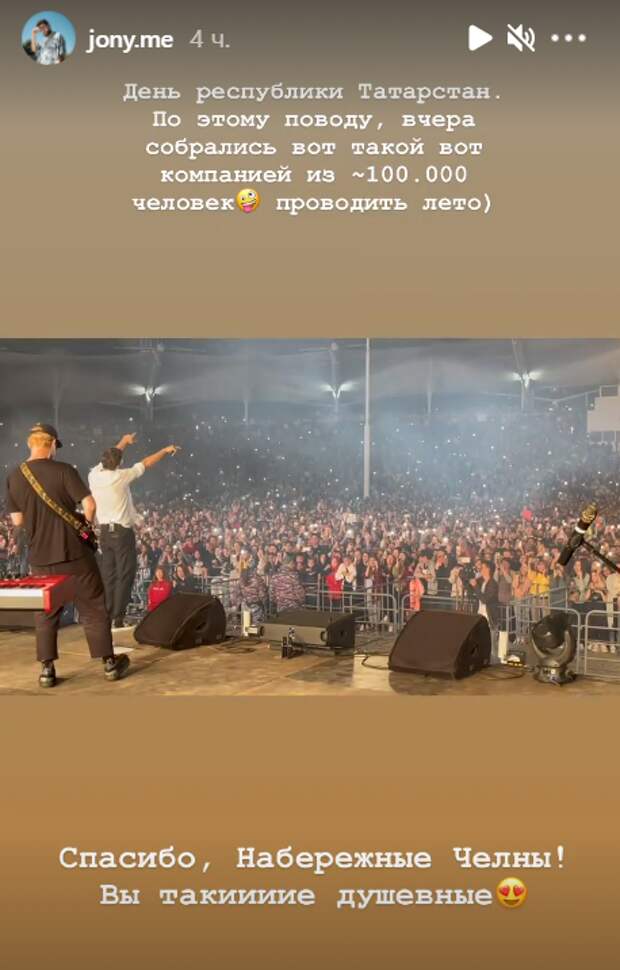 В Набережных Челнах во время празднования Дня республики выступил певец Jony. На его концерт пришло большое количество людей. Музыкант написал на своей странице в Instagram, что мероприятие посетили около 100 тыс. человек. В telegram-канале Mash Iptash сообщается, что Роспотребнадзор собирается наказать мэрию города, так как она не проследила за социальной дистанцией.