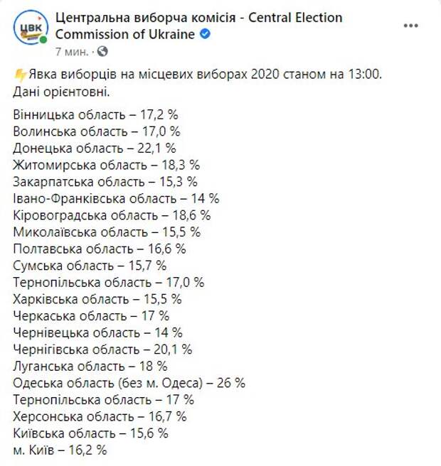 В воскресенье, 25 октября, в Украине проходят местные выборы Украинцы избирают депутатов в местные советы, а также мэров городов и населенных пунктов. По состоянию на 16:00 явка на местных выборах составила 27%. Об этом сообщает гражданская сеть «Опора». Отмечается, что на местных выборах 2015 года явка в это же время достигла 36,2%.