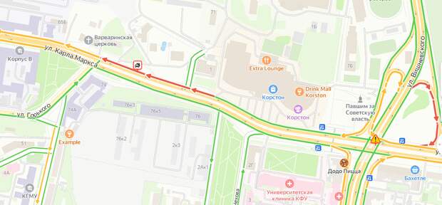 Сообщается и об аварии около Парка Горького — на улице Карла Маркса произошло ДТП, по словам очевидцев, в левом ряду. Фото: скриншот «Яндекс.Карты» Сильнее всего пробки ощущаются на ул. Сибгата Хакима и ул. Фатыха Амирхана (там протяженность пробки достигла километра). Крайне затруднено движение и по пр. Ибрагимова. Трудная дорожная ситуация и в Советском районе - заторы наблюдаются на улицах Аделя Кутуя, Гвардейской, Николая Ершова. Сообщается о двух ДТП на проспекте Победы — пробка там растянулась почти на два километра. Фото: скриншот «Яндекс.Карты» В начале февраля в Казани на Кировской дамбе в двух ДТП столкнулись в общей сложности восемь автомобилей. Из-за столкновения автомобилей оказались заблокированными трамвайные пути. Подписывайтесь на telegram-канал и группу «ВКонтакте» «Реального времени».