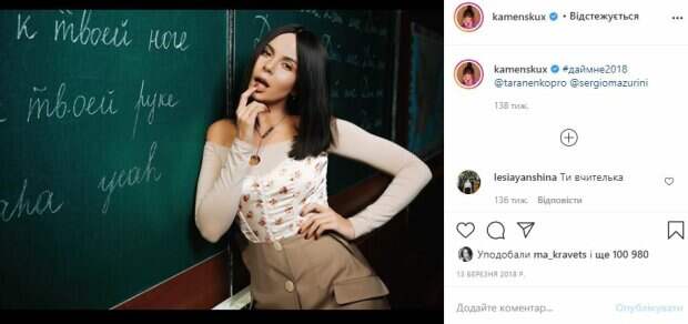 На втором кадре уже была Оля Полякова. Звезда показалась в халате и больших очках. Красотка смотрела в камеру, демонстрируя свой свежий образ. Закрывает тройку Анна Семенович. На кадрах певица была в юбке, пиджаке и очках, которые демонстративно натянула на себя. Звезда сидела на комоде, а после этого начала заигрывать перед камерой, показывая свое желание. Ролик вышел очень соблазнительным и кокетливым. На четвертом кадре уже была Злата Огневич. Артистка опубликовала фото, на котором позирует в светлом жакете и юбке за учительским столом, на котором стоят бутылки с жидкостями и оборудование для проведения химических опытов. В руках звезда держит две пробирки, а позади у нее доска с темой занятия. Всем своим видом девушка выражает строгость и сосредоточенность. Закрывает пятерку фитнес-модель Лекси Кай. Красотка была в маленькой верхней одежде с длинными рукавами и большим вырезом. Пышная грудь выпирала из декольте, притягивая взгляд, что сделало образ учительницы максимально горячим. Напомним, сочная Каменских в топике взорвала сцену с Аделиной из «Танців з зірками» А еще Politeka писала, что нежная Настя Каменских прильнула к статной красотке и призналась, что влюблена Также Politeka сообщала, что Настя Каменских не сдержала эмоций и поделилась своей радостью