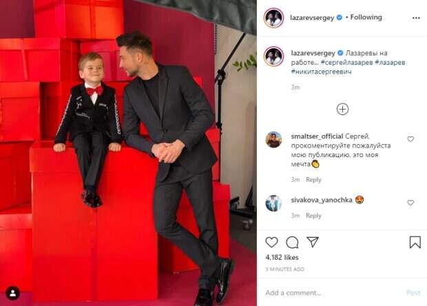 "Лазаревы на работе", - подписал снимок Сергей. Маленький Никита с оборожительной улыбкой забрался на самую большую коробку и свесил ножки. Мальчик нарядился в черный пиджак с белыми узорами, белоснежную рубашку, красный галстук-бабочку, черные брюки и туфли. Его звездный папа прислонился рядом в стильном сером костюме и черном пуловере и обратил на сына взгляд, полный любви и заботы. Пользователи соцсети оценили внешний вид Сергея Лазарева, которому приписывают роман с певицей Ани Лорак, а также его сынишки Никиты: "Какие вы стильные и красивые Мужчины!