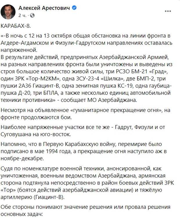 Ситуация в Нагорном Карабахе складывается катастрофически тяжелой для Армении В частности, Армения теряет почти по 100 человек убитыми в сутки. И даже если эти цифры "догоняют" данные за предыдущие сутки, темпы потери личного состава для армянской стороны весьма неутешительные: рота убитыми в сутки, ситуация близка к катастрофе.