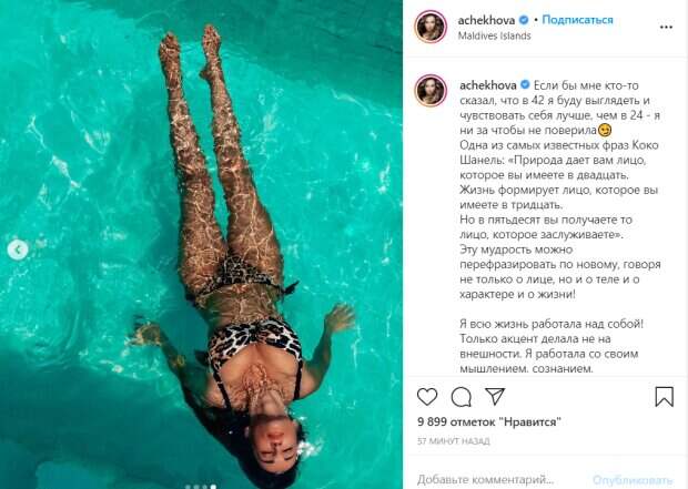 В подтверждение своих слов, телеведущая поделилась снимкам в бикини. По ее словам, ее феноменальная внешность далась ей непросто и ей приходилось прибегать к помощи специалистов. "Мне приятно осознавать, что в 42, я заслужила именно такое лицо и тело!", - рассказала Анфиса. Поклонники таким признанием телеведущей были воодушевлены и подписались по каждым ее словом в комментариях. "Блаженство", "Красотка! И фигура, и мышление и работа над собой