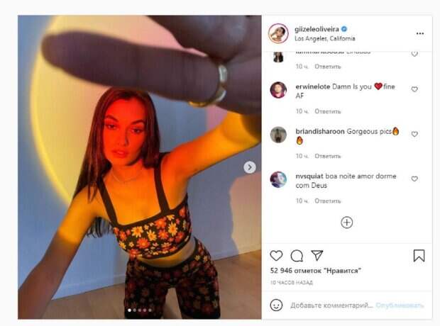Этот раз не стал исключением, ведь Оливейра опубликовала кадры в цветочном мини. Девушка со всех сторон себя сфотографировала, демонстрируя фигуру в полумраке. Фанаты поставили десятки тысяч лайков и написали комментарии: "Унеси нас вибрациями, детка", "Мне нравятся твои фото. Я сохранил все, чтобы попытаться воспроизвести", "Всегда такая красивая", "Кто-нибудь знает, где она взяла этот больной цветочный набор?!?!", "Ты такая восхитительно красивая", "каждый раз, когда вы используете этот закатный свет, мои глаза получили кайф". Сообщалось, что известная модель Жизель Оливейра показала себя в ярком пляжном образе. В этот раз Оливейра продемонстрировала на себе яркий пляжный образ. Модель позировала возле бассейна в купальнике, поверх которого надела ярко-синюю прозрачную сетку. Напомним, бразильская модель Victoria’s Secret в вязаном купальнике показала все достоинства фигуры Также Politeka писала, что бразильская красотка из "Victoria’s Secret" в новом бикини восхитила видом на пляже А еще Politeka сообщала, что бразильская красотка из "Victoria’s Secret" в платье с множеством вырезов показала свою красоту