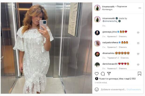 На новом фото Ирина показалаась в белом кружевном платье. Девушка стояла в лифте, позируя перед зеркалом. Ирина Горовая сразу прокомментировала фотографию, поставив смайлики "огонь" и "сердечко". Надя Дорофеева тоже оставила комментарий, поставив три смайлика "огонь". Фанаты поставили более 2 тысяч лайков и написали комментарии: "Обожаю тебя, обожаю этого дизайнера", "Вау", "Какое платье". Дмитрий тоже опубликовал видео, на котором наслаждался видом с балкона. "… и прямо под ресницы безопасности…" вот они, прорезаются через тучи…", - написал Монатик. Напомним, Монатик с женой показали, как развлекаются на заграничном курорте, кадры А еще Politeka писала, что Монатик покинул Украину и устроил жене идеальное свидание, о таком мечтает каждая Также Politeka сообщала, что жена Монатика заворажила украинцев видами на отдыхе в Италии