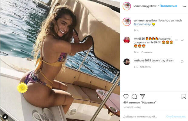 Американская фитнес-модель Соммер Рэй поделилась ярким пляжным фото из отдыха на яхте Спортсменка часто отдыхает на пляже и примеряет самые разные стильные бикини. Поскольку у модели есть собственный бренд спортивной одежды и купальников, она чаще всего рекламирует свою продукцию. На представленном кадре, который был опубликована на фан-аккаунте Соммер Рей, счастливая девушка отдыхала на яхте в цветном купальнике с желтыми резинками на бедрах и под грудью.