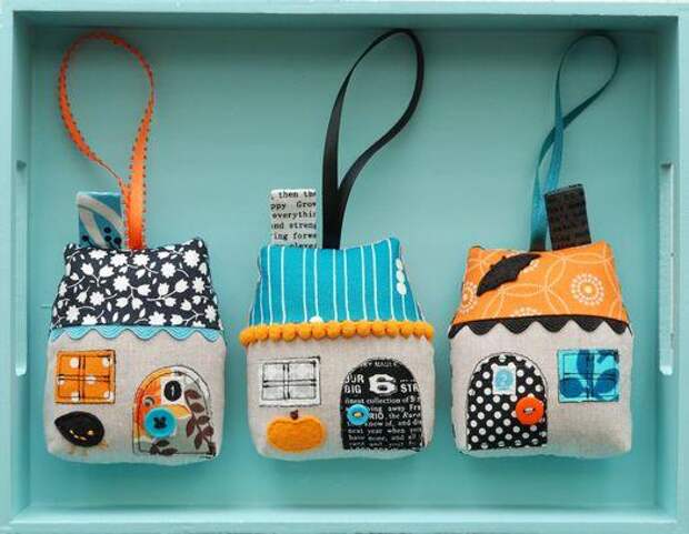 Простых навыков аппликации и лоскутного шитья (квилтинга или пэчворка) будет достаточно, чтобы сделать из обрезков разноцветной ткани забавные домики-сувениры, которые могут стать ароматными саше для дома или машины, игольницами или просто милыми игрушками. Материалы и инструменты: обрезки ярких тканей для декорамешковину или лен для основынабивка (холофайбер, синтепон и т.