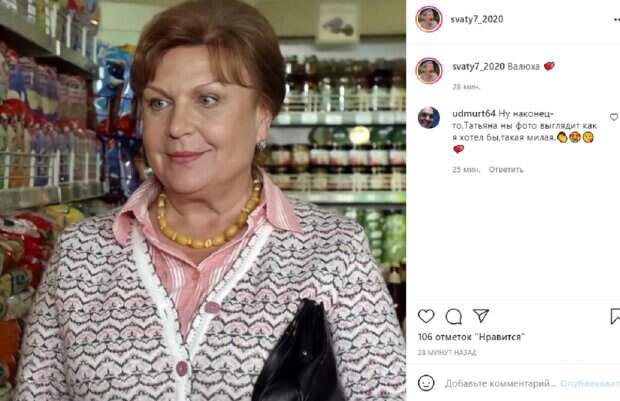 В сети всплыло фото, на котором звезда сериала «Сваты» Татьяна Кравченко пришла в магазин Фотоснимок обнародовали на одной из фан-страниц, посвященных российской актрисе, передает Politeka.net. В кадре Кравченко позирует в образе харизматичной Валюхи Будько, жены главного героя Ивана. Она пришла в магазин за покупками в нарядном виде.