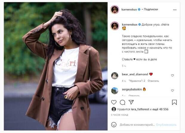 В этот раз Настя показала, как встретила понедельник. Каменских надела на прогулку джинсовые шорты, футболку и стильный пиджак. "Доброе утро, chérie. Такие сладкие понедельники, как сегодня, – идеальные, чтобы начать воплощать в жить свои планы, пробовать новое и начинать что-то с чистого листа. Ставьте, если вы в деле", - написала Настя под фотографией. Фанаты поставили более 47 тысяч лайков и написали комментарии: "Красотка, пиджак шикарный", "Всегда в деле", "Понедельник, как и новолуние, один вариант с тех, что есть мотивацией к действию", "Круто", "Настя крутышика", "Такой прекрасной девушке успехов в воплощении планов". Напомним, Осадчая закатила грандиозную вечеринку на дорогой яхте вместе с Каменских, Ефросининой и Астафьевой Также Politeka писала, что Каменских в кофточке с большим вырезом раззадорила кадрами на природе А еще Politeka сообщала, что Каменских заворожила формами, надев платье на тоненьких бретельках