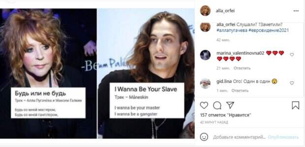 "Слушали? Заметили? #аллапугачева #евровидение2021", - спрашивает автор поста. "Ого! Один в один