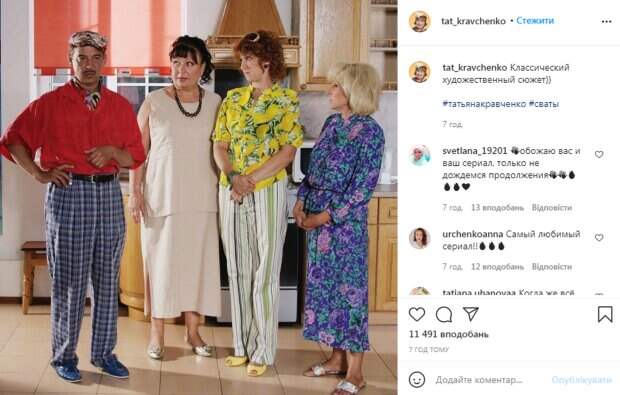 Поклонники "Сватов" ностальгируют по сериалу и расспрашивают, когда же ждать новых выпусков Об этом сообщает Politeka со ссылкой на фан-страницу одной из актрис сериала Татьяны Кравченко. Так, в фан-аккаунте Кравченко появилось фото со съемок, на котором позирует актерский состав "Сватов". "Классический художественный сюжет", - говорится в подписи к фото.