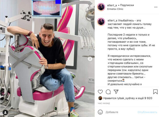 После его победы в проекте, он сошелся с актрисой. Недавно пара объявила о своём расставании. На этот раз Александр Эллерт опубликовал новую серию фото на своей странице в Инстаграм. На кадрах - он в стоматологии, победитель "Холостячки" показал, как изменил свою улыбку после проекта. "Улыбайтесь - это заставляет людей ломать голову над тем, что у вас на душе… ⠀ Последние 2 недели я только и делаю, что улыбаюсь, поговаривают и во сне тоже, потому что мне сделали зубы. И не просто, а вау-зубы)) ⠀ Я переодически интересовался, что можно сделать с моим «торчащим собачьим», со стертыми клыками или сколотым передним одни врачи советовали брекеты… другие спиливать… третьи - смириться... Всё свершилось за 1,5 месяца: мне какими-то спец капами отбелили, пофоткали, сделали макет, потом шесть часов я полежал в кресле и все, представляете? Всё! Вот она, обновлённая версия Эллерта Я доволен неистово, всем причастным спасибо и объятия!", - поделился радостью победитель "Холостячки". Напомним, что ранее Александ Эллерт выглядил так: Ранее сообщалось, брошенный Мишиной Эллерт поразил экстремальной выходкой в одних плавках, видео: "Но зачем?" Также, Эллерт исправил зубы и похвастался новой улыбкой, как он теперь выглядит: "Знаете, что обидно. .." Politeka рассказывала, Эллерт после ссоры с Мишиной дал напутствие новой "Холостячке" Огневич: "Желаю, чтобы она тоже..."