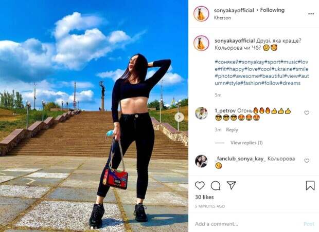 Племянница Софии Ротару и молодая исполнительница Соня Кей удивила откровенным нарядом во время прогулки Как сообщает Politeka.net, девушка опубликовала на своей странице в социальной сети "Инстаграм" фото, сделанное в Херсоне. Украинская певица вышла погулять на свежем воздухе, выбрав одежду темных тонов: кросовки, джинсы и топ с длинными рукавами, который обнажил плоский живот хозяйки и тесно обтянул ее бюст.