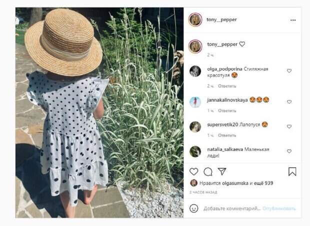 На фото, которое Тоня опубликовала в Инстаграм, Ева была в шляпке и платье в горошек. Девочка гуляла по двору, не надев на ноги обувь. Малышку сняли со спины, чтобы скрыть лицо. Фанаты, включая бабушку девочки Ольгу Сумскую, поставили почти тысячу лайков и написали комментарии: "Стильная красотка", "Лапотуся", "Маленькая леди", "Звезда моя, босиком, но в шляпе". Сообщалось, что старшая дочь украинской актрисы Ольги Сумской, артистка Антонина Паперная, похвасталась своих отдыхом. В новом посте Антонина Паперная поделилась фото, сделанным у бассейна. «Лето. Люблю», - коротко подписала актриса кадр. Паперная запечатлена в купальнике и мини-шортах. Летний образ она дополнила шляпкой и солнцезащитными очками. Актриса сидела на краю бассейна поставив ноги на надувной матрас в форме дольки арбуза. Напомним, дочь Сумской показала, как выглядит ее фигура после двух беременностей А еще Politeka писала, что дочь Сумской блеснула ножками в летнем платье и раскрыла секрет расслабления Также Politeka сообщала, что дочь Сумской в мини померилась точеными формами с подружкой на тренировке