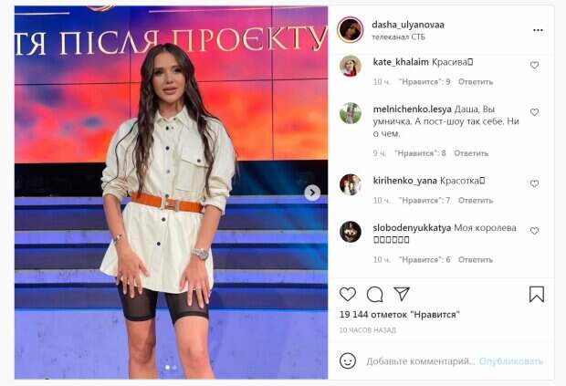 Сейчас красотка находится в идеальной форме, поэтому любой наряд на ней выглядит прекрасно. Так, на пост-шоу "Холостяк" Даша пришла в длинной рубашке, подчеркнув талию поясом и в полупрозрачных велосипедках. Завершили образ разные аксессуары, а также макияж с акцентом на глаза. "Спасибо телеканалу @stbua за приглашение на пост-шоу проекта @holostyakstb, который такой знаковый и важный для меня