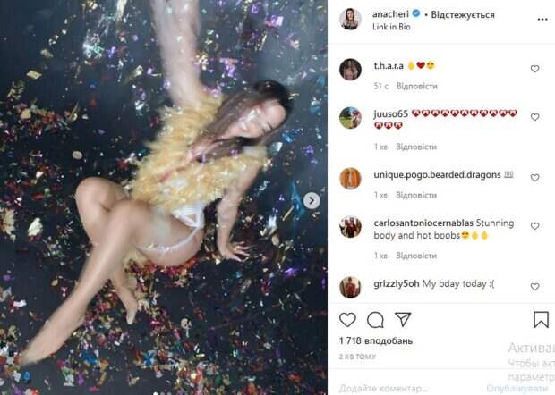 На опубликованных снимках Чери позирует в белоснежном боди после жаркой фотосессии, игриво поглядывая в кадр. На других кадрах красотка демонстрирует другие достоинства своей фигуры, показывая идеальный бюст, прикрытый руками. "Боже, ты королева Нового года. Красотка!", "божественное тело", "ты просто съела мое сердце", "фонд воспоминаний", "безупречный вид", "ох, ты просто непревзойденная!", "какое подтянутое тело и идеальный бюст", - пишут ее поклонники. Как мы писали ранее, фитнес-модель Ана Чери показала идеальное утро в постели Модель часто делится провокационными фото и показывает, как веселится на пляже в трендовых купальниках. Изюминка профиля Аны в Инстаграм в том, что она намерено хвастается фигурой в одном белье, демонстрирует подкачанное тело после тренировок и хвастается собственной коллекцией одежды. Напомним, Ана Чери поплескалась на курорте, приспустив мокрый топ с плеч А еще Politeka писала, что Ана Чери покрутила "орешком" перед зеркалом в тесных лосинах Также Politeka сообщала, что Ана Чери задала жару, выпятив румяные "булочки" на тренировке