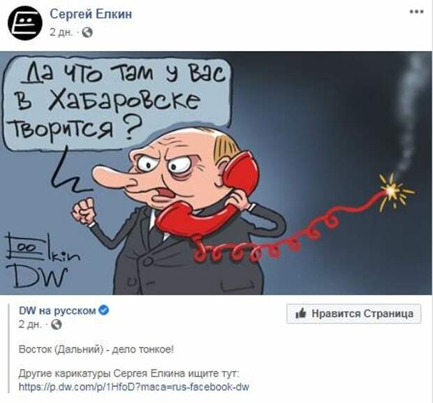 В привычном для себя стиле российского президента высмеял известный художник-карикатурист Сергей Елкин. На новой фотожабе можно увидеть разозленного Владимира Путина, который эмоционально разговаривает по телефону с подчиненными: "Да что там у вас в Хабаровске творится?". Пользователи с юмором отреагировали на публикацию художника и отметили, что Путин разозлился, поскольку не успел направить в Хабаровск бойцов Росгвардии. "Наступают последние дни упоротой ваты", "Восток оказался на столько дальним, что Путин из окна кремля не смог вовремя увидеть и направить Росгвардию...", "Хабаровчане очень молодцы", "Давно в России безмятежной, Москву никто так не пугал, как арестованный небрежно фургал", "Бумеранг летит, Вова", "Надо Памфилову назначить главой Дальневосточного телевидения, она быстро покажет "нужную" картинку с площадей", "Ручки в руке не хватает", "Держись, просроченный! Сейчас подгоришь!", "На Дальнем Востоке очень большой процент этнических украинцев! Вот, что творится", - шутят они в комментариях. Ранее мы рассказывали, как Владимир Путин оконфузился перед камерами. Так, президент РФ опозорился, пошутив в адрес США и представителей ЛГБТ-сообщества. «А в здании этом кто работает? Ну вот!»: Путин пошутил про вывешивание флага ЛГБТ на посольстве США», - говорится в подписи к видео, на котором запечатлен конфуз Путина. Пользователи гневно отреагировали на публикацию и добавили, что у Владимира Путина шутки как "из подворотни". Напомним, помолодевший Путин в нелепом наряде довел россиян до слез Как сообщала Politeka, Путин позволил себе лишнего перед камерами, кадры позора повеселили россиян Также Politeka писала, что Путин вышел на связь и довел россиян до слез своим трусливым поступком, фото