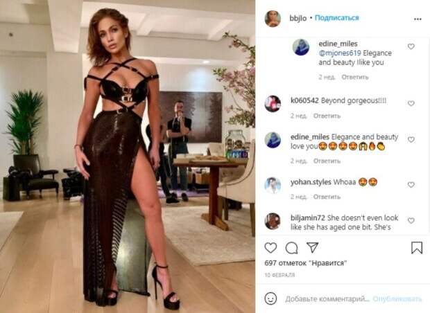 Лопес позировала, скорее всего, в одном из своих сценических образов, облачившись в платье, состоящее из полупрозрачной длинной юбки с безумным разрезом до бедра и верха с кожаными ремнями, которыми та дерзко стянула свои "дыньки". Босоножки на высокой шпильке, яркий макияж в бронозвых тонах и прическа с эффектом мокрых волос дополнили этот шикарный лук. Пользователи с восторгом кинулись комментировать увиденное, не жалея комплиментов: "Такая красивая