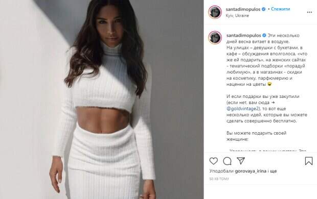 Так, в канун женского праздника звездная красотка порадовала поклонников очаровательным фото, а в подписи к нему поделилась оригинальными идеями подарков для женщин на 8 марта. На новом фото Санта запечатлена на залитой солнцем улице, она томно позирует фотографу, слегка выгнув спинку. Перед камерой красотка появилась в уютном белом костюмчике, который состоит из облегающей юбки и короткой кофточки с воротником, которая оголила идеальный рельефный животик. Волосы певицы распущены и мягкими прядями спадают на плечи, а на ее лице легкий макияж, она загадочно смотрит в объектив. В подписи к фотографии Димопулос поделилась своими идеями подарков для женщин, среди которых называет "Уверенность в ваших чувствах", "Равноценное партнерство", "Заботу", "Приоритетность", "Время вдвоем", "Поддержку во всех ее начинаниях". "Эти несколько дней весна витает в воздухе. На улицах – девушки с букетами, в кафе – обсуждения вполголоса, «что же ей подарить»", - написала Санта и объяснила каждую из своих идей. Напомним, Димопулос из "Танців з зірками" восхитила результатами тренировок в спортзале: "Идеально". Как сообщала Politeka, Расслабленная Димопулос из «Танців з зірками» развалилась на диване, впечатлив признанием: «Мне нравится…». Также Politeka писала, Фигуристая Димопулос из "Танців з зірками" в бикини свела с ума фантастическим пейзажем: "Амазонка".