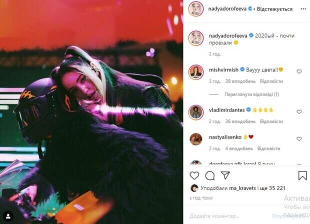 Среди тех, кто прокомментировал фотографию, оказался и муж звезды Владимир Дантес, который отправил стикеры в виде пожара. «Вау, цвета огонь», «следующая остановка – 2021-й», «это пожар, Надя! Особенно неоновая подсветка», «фотка просто бомба», «будем врываться в 2021-й», «бежим навстречу 2021 году, с вашей музыкой в наушниках», - пишут ее поклонники. Как мы рассказывали до этого, украинская певица удивила новой внешностью рядом со своим продюсером Потапом в шоу "Вечерний квартал" Надя и Алексей Потапенко (настоящее имя продюсера) оказалась за одним столом с другими коллегами по шоу-бизнесу: Дмитрием Монатиком, Натальей Могилевской и руководителем "Квартала 95" Евгением Кошевым. Другие звезды внимательно изучали листы со сценарием, пока Потап озвучивал свои реплики. Напомним, как растерянную Дорофееву в развратном мини публично "арестовали" и поставили в неудобную позу Как сообщала Politeka, разукрашенная Дорофеева показала свою красоту максимально близко. Также Politeka писала, что Дорофеева в латексе свела с ума откровенным образом