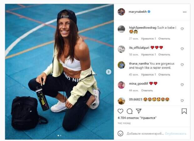 Этот раз не стал исключением, ведь Марина в Инстаграм опубликовала фото, на котором позировала в спортивных штанах, топе и кофте, которую спустила с плеч. Красотка сидела на новой спортивной площадке, демонстрируя роскошную рельефную фигуру. "Рад посетить новую детскую площадку в моем городе", - написала Марина под фотографией. Фанаты поставили более 4 тысяч лайков и написали комментарии: "Ну как можно быть такой красивой, как?)))", "У тебя потрясающий загар", "Вы великолепны и крепки, как рапира", "Такая детка!". Сообщалось, что известная украинская спортсменка Марина Бех-Романчук показала себя, признавшись в любви. Марина показала снимок, на котором была в светлом мини-бикини и очках. Девушка стояла у бассейна, демонстрируя роскошную фигуру. "Последняя неделя, чтобы начать этот тренировочный сбор, теперь нужно быть сильнее, чем раньше", - написала Бех-Романчук под фото. Напомним, украинская чемпионка Бех-Романчук покорила изгибами в красном мини-бикини Также Politeka сообщала, что украинская чемпионка Бех-Романчук показала результаты тренировок в спортзале А еще Politeka сообщала, что украинская чемпионка Бех-Романчук в мини-бикини показала эталон женской фигуры