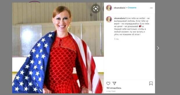 Оксана Баюл, которая накануне отказалась от украинского гражданства, опубликовала новое фото с намеком Бывшая фигуристка в День Независимости Украины опубликовала фото, на котором видно, как она закуталась в флаг США и улыбается. "Если тебя не любят - не выпрашивай любовь. Если тебе не верят - не оправдывайся.