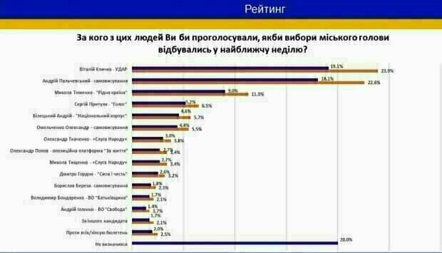Согласно полученным цифрам, которые представили социологи, нынешнего мэра Виталия Кличко готовы поддержать на выборах 19.1% и 23.9% среди тех киевлян, кто определился со своим выбором. А общественного деятеля Андрея Пальчевского хотят видеть мэром Киева 18,1% и 22,6% среди тех, кто уже решил, за кого проголосует. Первая пятерка вероятных кандидатов на пост мэра Киева выглядит следующим образом: 1. Виталий Кличко - 19,1% 2. Андрей Пальчевский (самовыдвиженец) - 18,1% 3. Николай Томенко ("Рідна країна") — 9% 4. Сергей Притула ("Голос") - 5,4% 5. Андрей Билецкий ("Национальный корпус") - 4,6%. Как утверждает эксперт Николай Спиридонов, "позиции действующего мэра достаточно шаткие", а феномен падения личного рейтинга Виталия Кличко можно объяснить тем, что городской голова пытался пиариться на ежедневных брифингах. Что касается потенциальных кандидатов на пост мэра Киева от "Слуги народа" Николая Тищенко и Александра Ткаченко, то они не попали даже в ТОП-5. Такой провал социологи объяснили обвалом рейтинга самой президентской партии. Напомним, что Зеленский не смог оправдать надежд, Пальчевский предупредил о расплате: "К осени...". Как сообщала Politeka, дело Порошенко замяли, Пальчевский раскрыл скандальные подробности. Также Politeka писала, что Пальчевский раскрыл украинцам глаза на масштабы экономического провала