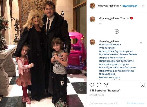 При этом дети одеты просто и по-домашнему. Стоит отметить, что Алла Борисовна на фото выглядит гораздо моложе своего возраста. Примадонна приобнимает мужа и дочь и счастливо улыбается. Поклонники знаменитостей не смогли обойти такой снимок стороной. «Дети раздеты, а родители в пОльтах», «Красивая пара а детишки просто супер. Огромного счастья вам», «Без пафоса и очень приятно смотреть», «Аллочка красавица эта прическа вам очень идет», «Аллино счастье», «В ее то возрасте и занимается детками молодец», - пишут люди. До этого мы писали, что Примадонна опубликовала в своем микроблоге в Инстаграм архивный снимок, на котором предстала в окружении известных друзей. Так, модельер Валентин Юдашкин вклинился между нею и ее мужем Максимом Галкиным. 14 октября мэтру исполняется 57 лет, с чем его и поздравила Алла Борисовна. На фото они с "королем моды" сидят вдвоем в кресле. Пугачева в узких рваных джинсах и розовом пуловере нежно обняла друга за спину и прижалась к нему. Напомним, Пугачева в порыве страсти бросилась к любовнику на сцену, появилось видео: "Шикарная пара!". Как сообщала Politeka, Пугачева при живом Галкине украдкой пообнималась со старым другом: "Алла совсем...". Также Politeka писала, что Галкин сравнил себя в детстве со своим сыном, сходство впечатляет: эмоциональные кадры.