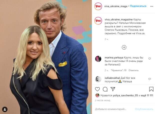 45-летняя украинская певица Наталья Могилевская закрутила роман с очередным красавчиком, который уж больно кого-то напоминает Как передает Politeka.net, в сети появилось совместное фото артистки с бизнесменом-миллионером Олегом Рыжовым. Снимок опубликован в Инстаграм журнала "Viva!". В подписи отмечается, что Могилевская впервые вышла в свет с новым ухажером и что, мол, у них "все серьезно".