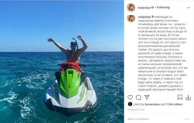 Алексей Потапенко (настоящее имя продюсера) с довольной улыбкой вскинул обе руки вверх, будто танцуя. "Наблюдая за подводным миром отчетливо понимаешь две вещи, ты - дома, ты - в гостях! Дома, потому что ты часть этой великой экосистемы и когда-то и сам вышел из воды. В Гостях, потому что ты уже настолько забыл, кто ты и откуда ты, что просто стал инопланетянином для жителей глубин", - отметил Потап. - "По дороге, достаточно длинной, от рифа к рифу, я видел пластиковую бутылку, ботинок и ананас, артефакты присутствия нас, но океан мощнее человеческой цивилизации, он встроит все, что мы набросали в голубую воду, в свою экосистему. Если оставить этот Джет в воде, то через 2 недели в нем будут жить крабы, а через год он станет Рифом, давайте дружить с природой, Матерью Нашей". Пользователи сети оценили высказывания рэпера в комментариях, даже Настя Каменских не удержалась и отреагировала: "Круто!"; "класс