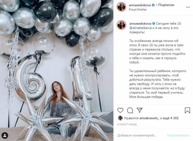Алина позировала на кровати в серой пижаме рядом с надувными звездами. Над девушкой, под потолок тянулись шарики. "Сегодня тебе 16 @alinabelkevia и я не могу в это поверить! Ты особенная, всегда помни об этом. В свои 16 ты уже жила в трех странах и пережила столько, что иногда мне хочется просто подойти к тебе и сказать, как я горжусь тобой. Ты удивительный ребенок, которого не нужно контролировать, чтоб добиться результата. Тебе нужно дать свободу. И хоть с этим не всегда у меня получается, но я буду стараться. Ты мой первый учитель. Моя большая победа. И я всегда буду рядом. Несмотря на все твои странные решения