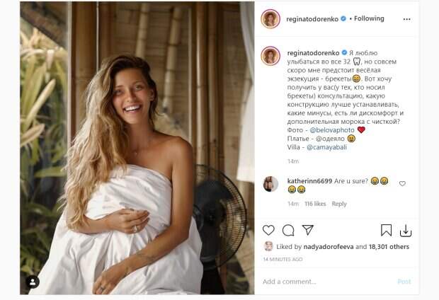 Известная телеведущая Регина Тодоренко, звезда тревел-шоу "Орел и Решка" впечатлила пикантными шалостями во время отпуска Как сообщает Politeka.net, она разместила на своей странице в соцсети "Инстаграм" фото, сделанное в домике на экзотическом курорте Бали. Красотка расположилась перед камерой в неглиже и прикрылась лишь белоснежным одеялом в спальне, похоже, девушка даже не надела бюстгальтер.