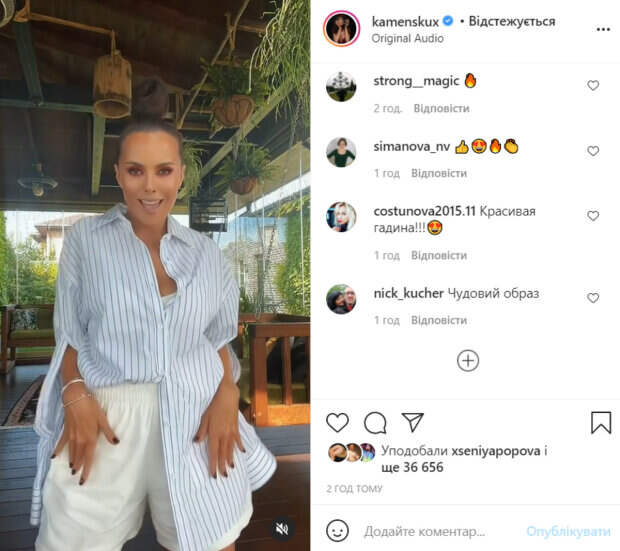 Каменских была одета в шорты и просторную рубашку, а ее волосы были собраны в тугой пучок. Но особое внимание поклонников привлек неестественный загар звезды. Многие подумали, что это неудачный фильтр, который использовала певица для видео. «Потанцуем?», - подписала видео звезда. В комментариях ей оставили массу приятных слов. Не обошлось и без колких замечаний. «Не очень», «Лучшая», «Язык живёт своей жизнью просто. Хорошо, что не вывалила его под шикарную песню Кайли Миноуг», «Классно в таком образе», «С носом уже тоже что-то не то», «Шикарна», «Элегантна», «Красивая гадина!», «Настя, Вы очень крутая, обожаю Вас и Ваше творчество», - пишут пользователи сети. Напомним, что Каменских разочаровала украинцев изменившейся фигурой: "До похудения была...". Как сообщала Politeka, Каменских ошеломила видом после смены имиджа: "Ох уж эта школьница...". Также Politeka писала, что Настя Каменских устроила заплыв на глазах у Потапа: "Холодненький".