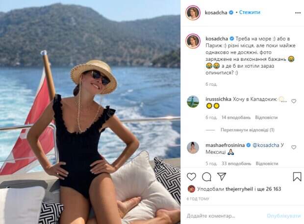 Осадчая позировала на яхте, усевшись на подушках диванчика. Образ дополнили соломенная шляпка и солнцезащитные очки. Ведущая одарила зрителя голливудской улыбкой, привстав на коленях и поставив руки на пояс. "Надо на море :) или в Париж :) различные места, но пока почти все равно не достижимы. Фото заряженное на исполнение желаний