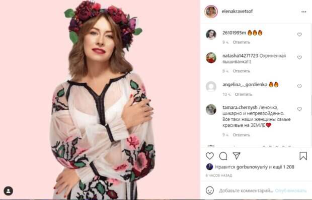 Как известно, Кравец покинула "Женский квартал", засветившись в новом шоу "Твой день" на телеканале "1+1". Она решила сменить не только род деятельности, но и прическу, подстригшись "под мальчика". На опубликованном фото Елена, еще с длинными локонами, позировала в платье-вышиванке, выполненной из прозрачной ткани и украшенной цветами. Звезда скрестила руки на груди, прикрыв белый лифчик, видневшийся сквозь тонкую ткань. Дополнил лук в украинском стиле пышный венок на голове. "Такая красивая фотография!