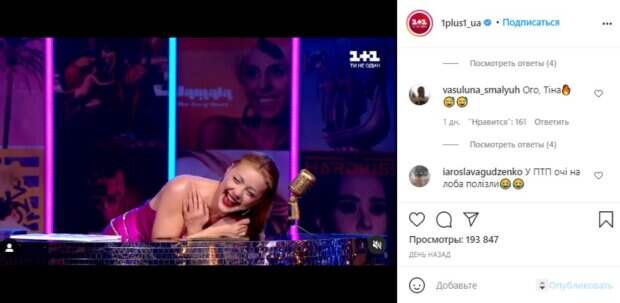 Хохотушка Кароль, в розовом обтягивающем платье на шлейке, усыпанной камнями, бурно отреагировала, когда ее коллега-ведущий Потап объявил следующих участников - хореографов Влада Яму и Евгения Кота. Певица заливисто смеялась, когда внезапно с нее слетел наряд - расстегнулась шлейка. Тина молниеносно прижала руки к груди, тем самым успев прикрыть свою пышную "гордость", и опустилась под стол, засмеявшись еще сильнее. Интересно наблюдать за реакцией мужчин, находившихся на сцене. Потап замер в неожиданности, а джентельмен Яма тут же отвернулся. "Прекрати показывать свой пресс. Ты видишь, что с ней происходит", – обратился Потап к Коту, когда отошел от шока. Пользователи с энтузиазмом обсудили увиденное: "Ого, Тина