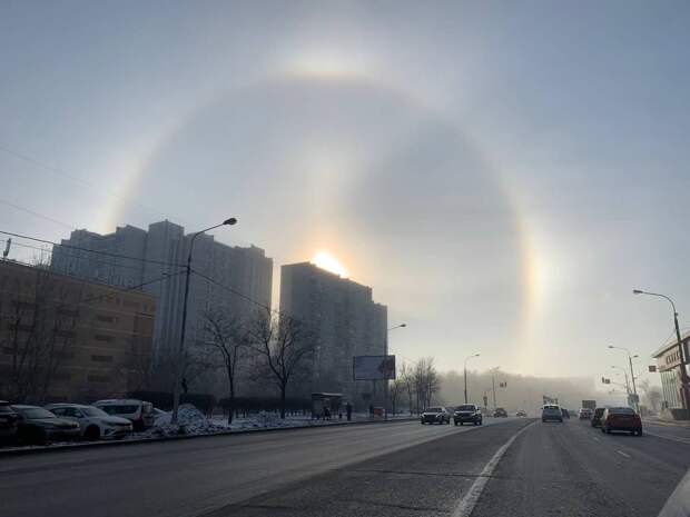 Главный специалист московского Метеобюро Татьяна Позднякова заявила, что в среду, 30 ноября, в Москве были все условия для появления солнечного гало, поэтому жители столицы действительно могли наблюдать редкое явление. Об этом пишет РИА Новости. Фото: smartik.ru Солнечное гало – это атмосферное оптическое явление.
