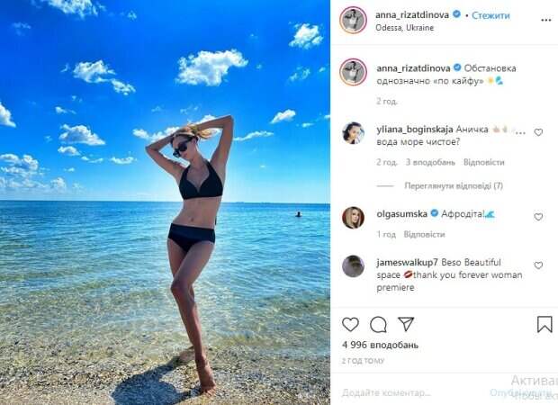 Это стало причиной бурных комментариев со стороны ее поклонников. Среди них оказалась и легендарная украинская актриса Ольга Сумская, которая написала, что гимнастка выглядит как «афродита». «Очень красиво выглядишь», «самая красивая женщина в мире», «идеальный вид», «вау, шикарная», «мощ», «загляденье», — пишут они. До этого мы рассказывали, что украинская гимнастка Анна Ризатдинова, звезда "Танців з зірками", показала себя и похвасталась отдыхом. На фото Ризатдинова позирует в черном купальнике, а образ дополнила стильными очками. Красотка лежала на шезлонге, соблазнительно изогнувшись. Звезда не смотрела в объектив камеры, а волосы оставила собранными в хвост. Анна находилась у бассейна в Одессе, куда она отправилась в отпуск. Напомним, фаворитка Ямы из "Танців з зірками" сразила длиной ног в пикантном костюме Также Politeka сообщала, что любимица Ямы из "Танців з зірками" вскружила голову в прозрачной сеточке, кадры А еще Politeka писала, что любимица Влада Ямы из "Танців з зірками" выставила свою гордость в открытом платье
