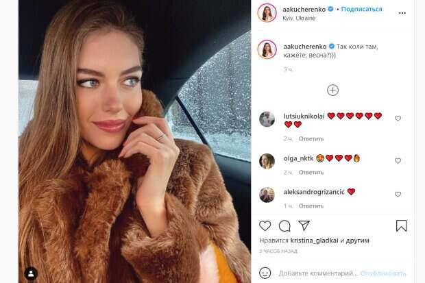 Александра Кучеренко похвасталась селфи-сником, сделанным в салоне автомобиля. Из-за холодной погоды она надела в этот день теплую меховую шубку, в воротник которой старалась спрятать нежные щечки, но ее грели мысли о весне, которая по календарю наступит уже через полторы недели. На снимке Александра Кучеренко отвела сияющий взгляд в сторону и улыбнулась своей самой роскошной улыбкой. Модель сделала превосходный и одновременно сдержанный макияж, который идеально подчеркнул ее природную красоту. Ее густые брови были слегка подведены темным цветом, а глаза подчеркнули коричневые тени в уголках глаз и темно-коричневая тушь для ресниц. Завершила мейкап приятная кремовая помада естественного оттенка, которая смотрелась на пухленьких губках просто идеально. Весь образ Александры был лаконичным и продуманным. Длинные русые волосы были уложены на бок, добавляя объема прическе, а хорошее настроение красотки добавило ей еще большего шарма в холодный зимний день. "Так когда там, говорите, весна",- написала Александра Кучеренко к своей публикации. Поклонники Александры, глядя в эти невероятно глубокие и выразительные глаза, так и не смогли до конца поверить, что можно обладать такой красотой, поэтому в своих комментариях они засыпали девушку комплиментами. "Как всегда красавица", "Оооочень-очень красивая", "Вы нереально красива", "Совершенство!", "Прекрасно выглядите", "Вы почему такая красивая?", "Богиня",- написали фолловеры в соцсети. Напомним, жена Комарова из "Мир наизнанку" выдала секрет своего супруга: "В Украине, как в Пакистане..." Как сообщала Politeka, молодая жена Комарова из "Мир наизнанку" поразила снимком во время прогулки: "Страшно даже представить..." Также Politeka писала, что Санта Димопулос из "Танців з зірками" показала, как ей повезло с мужем: "Мальчики всегда вас балуют"