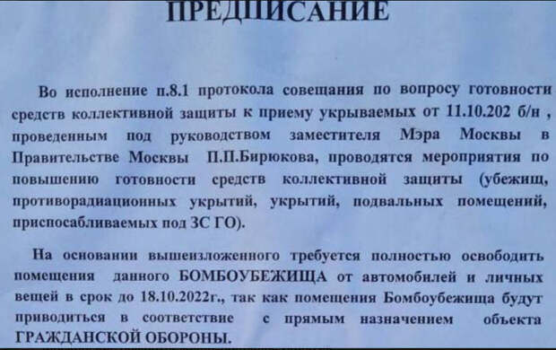 Очевидцы сообщили, что на подъездах московских домов появились объявления о подготовке подвалов, бомбоубежищ и укрытий «в соответствие с прямым назначением объектов гражданской обороны». В них сказано, что в Правительстве Москвы проводятся мероприятия по повышению готовности средств коллективной защиты.