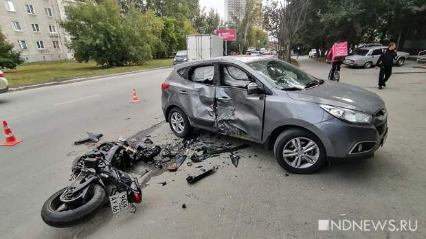 Екатеринбург, Сентябрь 14 (Новый день, Светлана Загороднева) На улице 40-летия ВЛКСМ случилось смертельное ДТП. Дорогу не поделили мотоциклист и кроссовер «Хендай». У байка после удара оторвало бак, разбита вся передняя часть, на машине серьёзные вмятины.