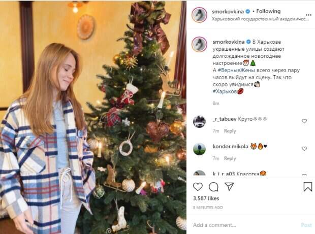 ЕЕ домашний образ дополнили распущенные волосы, которые прикрыли плечи. Анна Кошмал позировала в комнате перед небольшой наряженной елкой в Харьковским государственном академическшм украинском драматическом театре. Она засунула руку в карман штанов и зажмурилась от удовольствия с трогательной улыбкой на лице. "В Харькове украшенные улицы создают долгожданное новогоднее настроение