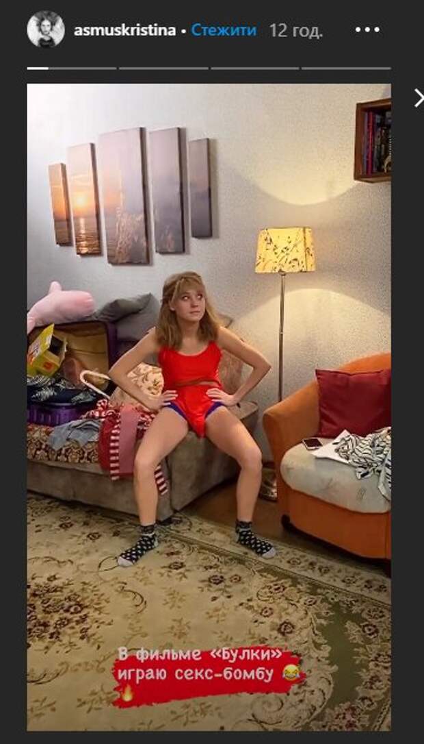 Кристина Асмус вошла во вкус, играя раскрепощенных женщин в фильмах: подобные роли сыпятся на звезду одна за другой Как передает Politeka.net, 32-летняя актриса опубликовала новые "сториз" в Инстаграм, на которых предстала в несколько нелепом виде. Так, Кристина позировала в захламленной комнате, сидя на быльце дивана.