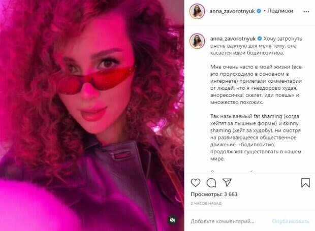 Анна обтянула тонкую талию толстым пояском. Завершили образ стильные очки. В руках горячая красотка держала маленького милого песика. В посте девушка рассуждала на тему бодипозитива. "Мне очень часто в моей жизни (все это происходило в основном в интернете) прилетали комментарии от людей, что я «нездорово худая, анорексичка, скелет, иди поешь» и множество похожих. Так называемый fat shaming (когда хейтят за пышные формы) и skinny shaming (хейт за худобу), несмотря на развивающееся общественное движение - бодипозитив, продолжают существовать в нашем мире", - написала Анна. По словам модели, идея бодипозитива заключается в том, чтобы воспринимать свое тело без критики. Девушка попросила не писать ей сообщения на тему, как ей набрать вес. "Мне комфортно, я люблю вкусно поесть, занимаюсь йогой, спортом, прекрасно себя ощущаю и мне в голову никогда не придет написать кому-то «поправься или похудей», так как я уважаю выбор каждого человека, который в праве распоряжаться своим телом, так как он хочет", - подытожила красотка. "Анечка,у тебя идеальная фигура